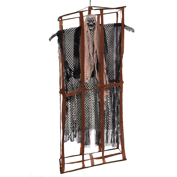Sound Activated Hanging Ghost – Caged Skeleton with Tattered Cloth & Light for Haunted House Halloween Decor